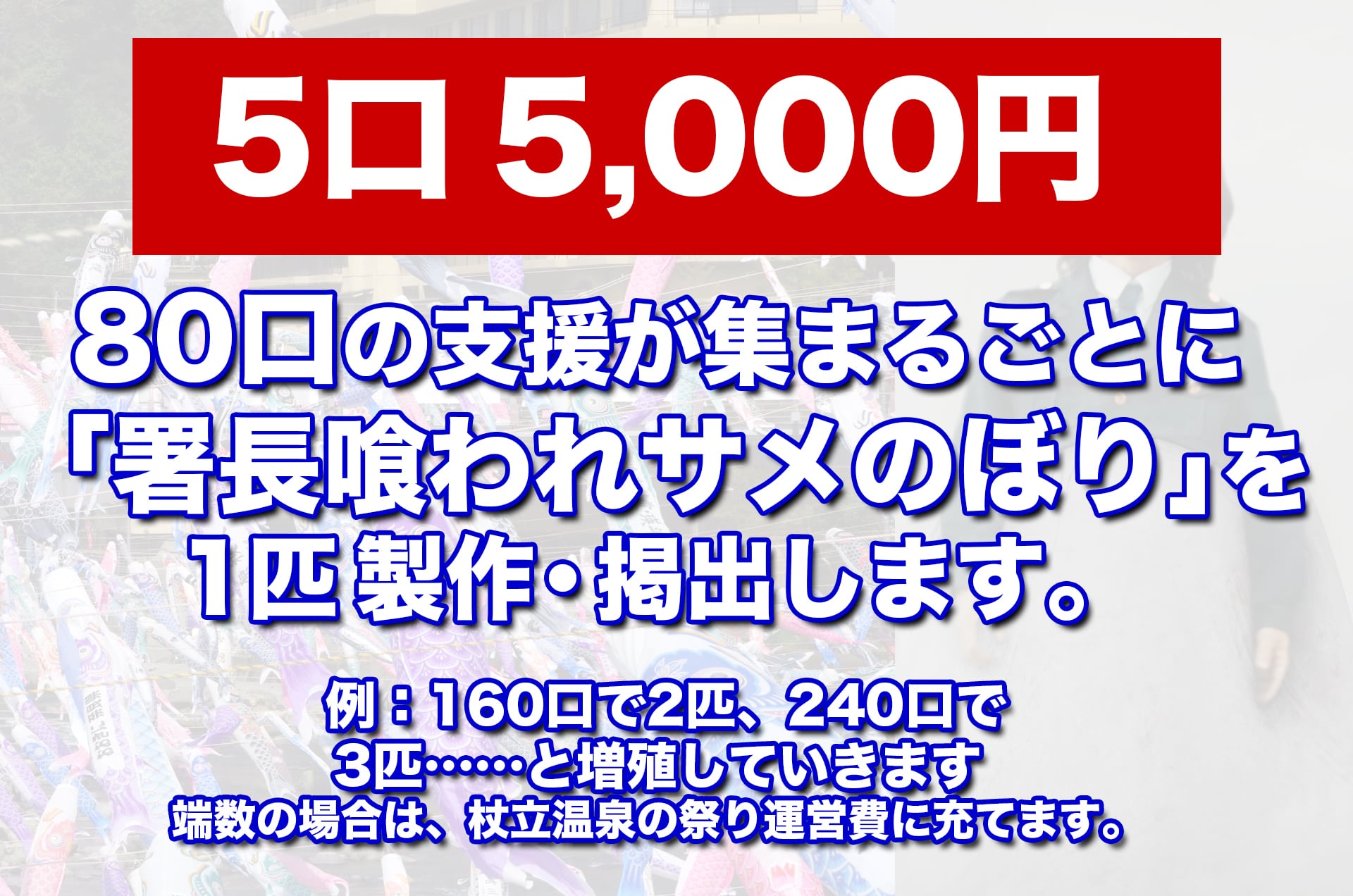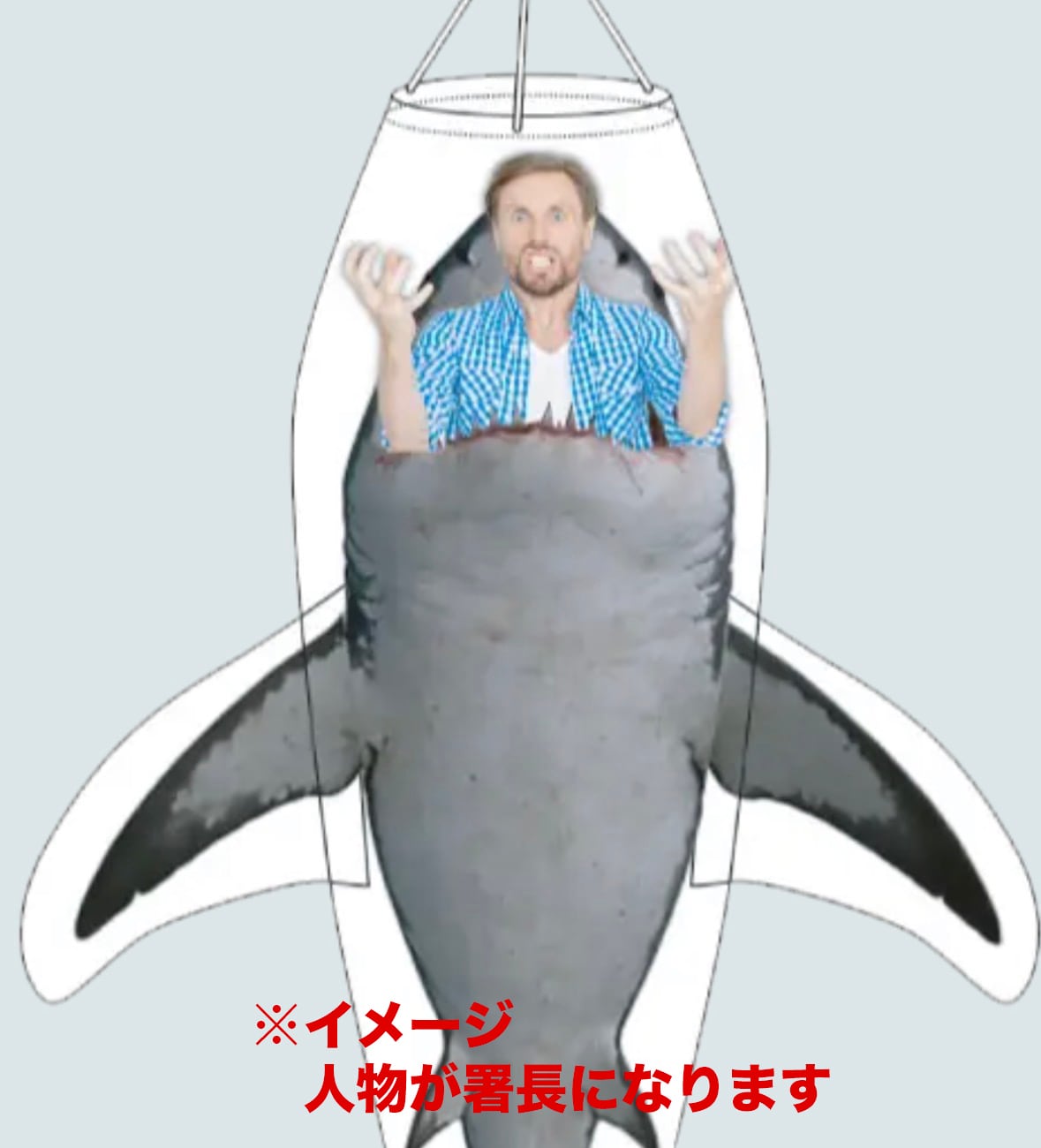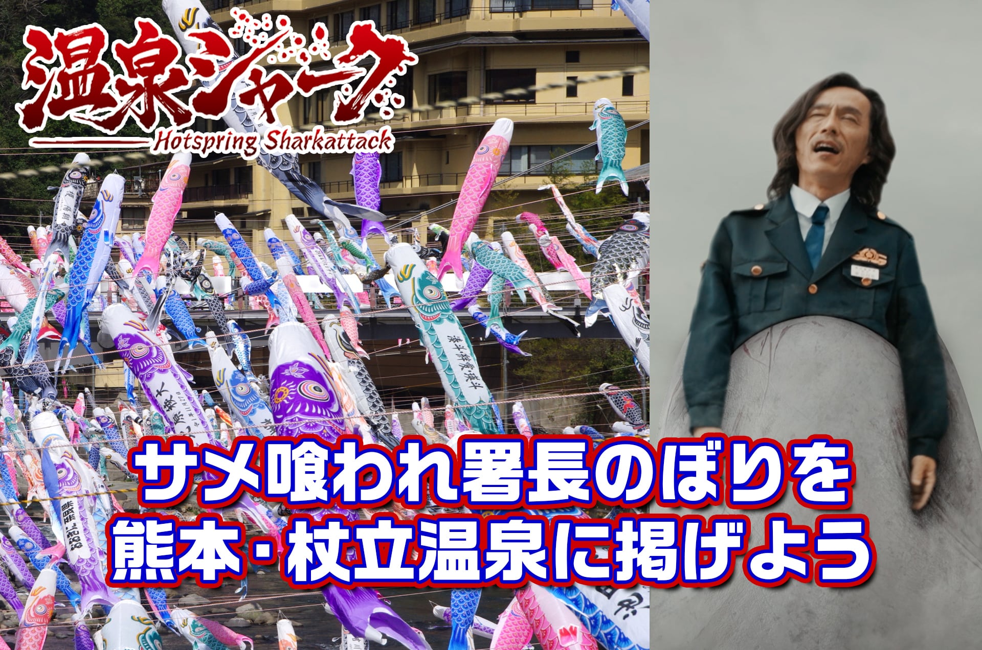 本商品は、熊本県小国町杖立温泉 2026年春の祭りに「署長喰われサメのぼり」を掲げるための、有志による一口制作支援プロジェクトです。 皆様の清き一票(支援)が集まることで、署長が空高く舞い上がります。